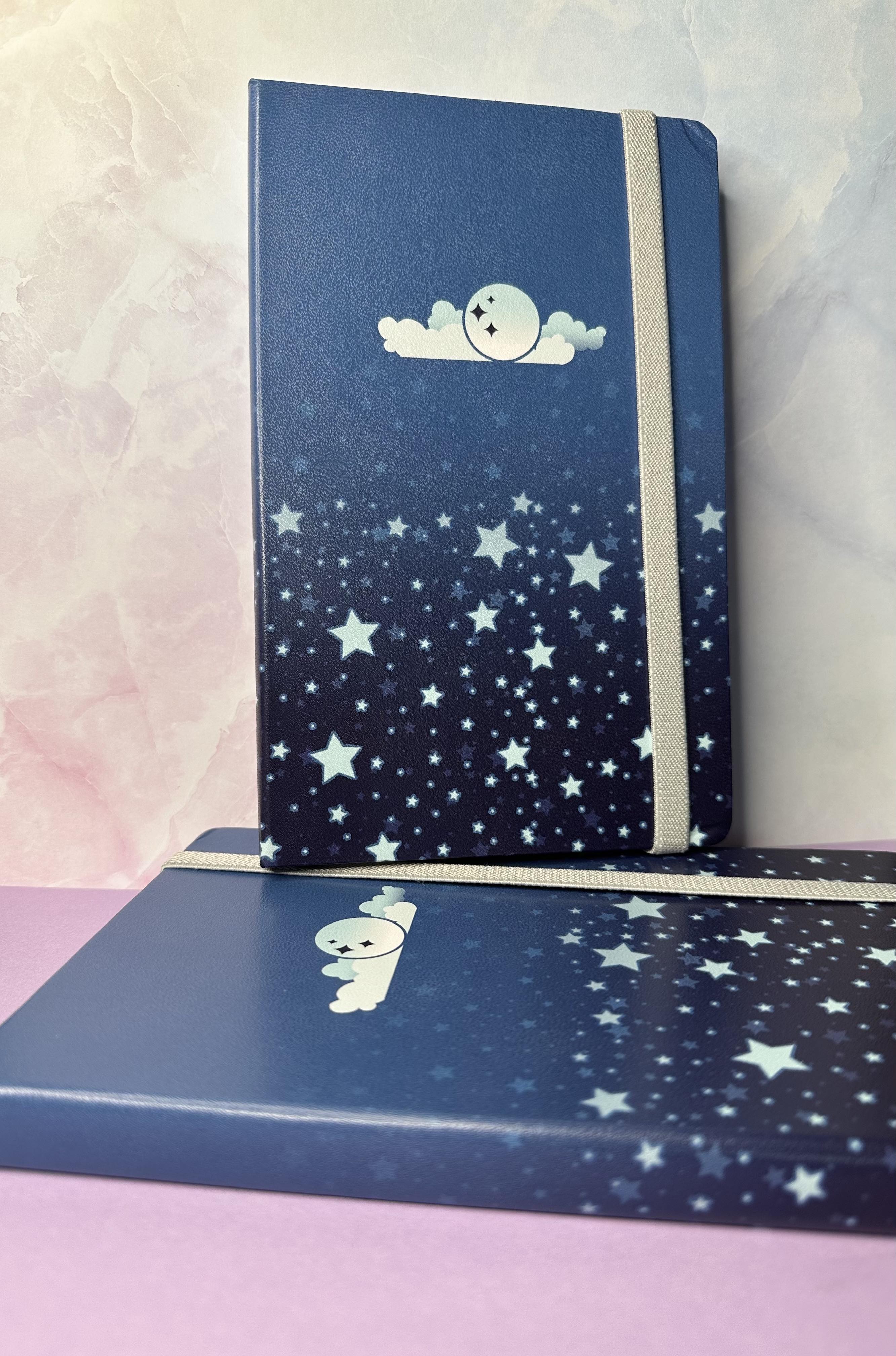 Our Bluemoon/Stars custom design on a 9" x 6" Leatherette Notebook! This notebook comes with a colored bandage as well as a colored bookmark ribbon and contains 192 pages.